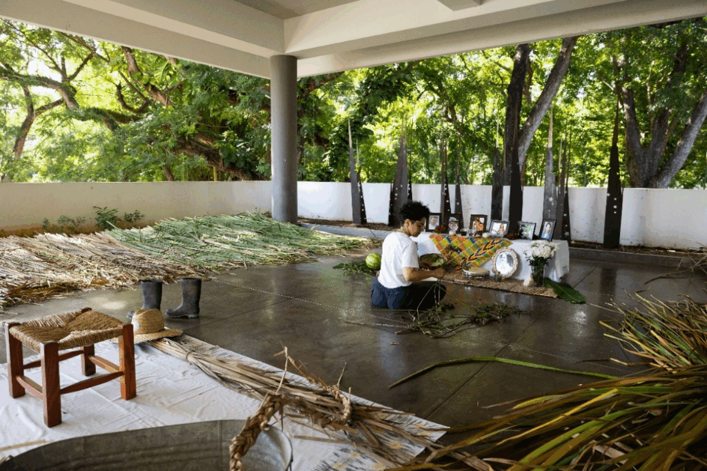 Entre las fibras de enea que Joma trenzó día tras día en el tiempo/espacio del encuentro, algo en común parecía gestarse, hacerse tangible. No era un manifiesto definitivo, sino un boceto; no una conclusión, sino un entramado. La cultura, como afirma Vich, es precisamente “aquel agente que establece y regula la forma en que se practican las relaciones sociales”: esas que mantenemos a diario y las que se extienden a través de los vínculos que nuestra propia agencia traza. En ese tejido de relaciones nos encontramos y desencontramos, transformamos sentidos y negociamos prácticas. Es un proceso nunca terminado, un constante devenir que el pensador cubano Fernando Ortiz conceptualizó brillantemente como el ciclo de la transculturación: ajuste, desajuste, reajuste (Ortiz). En cada encuentro, el telar del ciclo se pone en marcha. Ahora, siendo cónsona con la obra de la artista, que convirtió un acto de sobrevivencia en un ritual y una materia prima en un símbolo de encuentro, solo resta preguntar, considerando que el arte de hacerse preguntas es el derecho cultural fundamental: