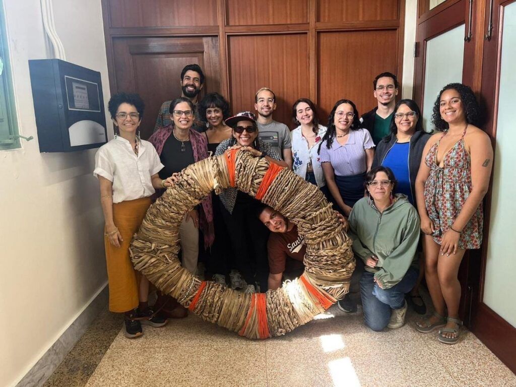 Jomary Ortega y la Dra. Mareia Quintero junto al equipo de estudiantes becarixs de la Mellon Foundation, quienes organizaron el Encuentro. Aquí la obra, resultado de la residencia, que se conserva y exhibe en la oficina de MAGAC, Universidad de Puerto Rico, recinto de Río Piedras. Imagen: Pedro Reina.