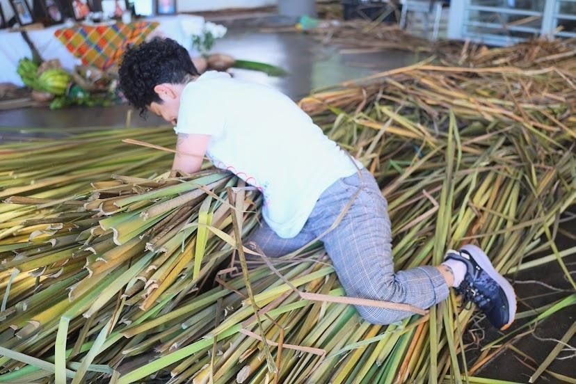 Con machete en mano, botas de goma y un collar de cuentas, Joma llegó al recinto de Río Piedras directamente de cosechar enea en los humedales de Santa Bárbara, Canóvanas. Verla descargar esos mazos verdes en el Centro de Estudiantes me produjo una sensación de transgresión; su práctica ancestral parecía dislocada en aquel espacio universitario. Así comenzaba su residencia artística en el segundo Encuentro Puertorriqueño de Gestión Cultural.